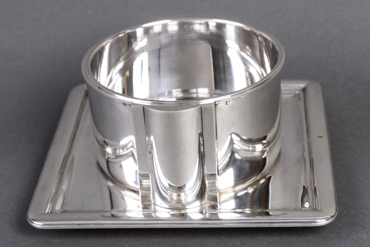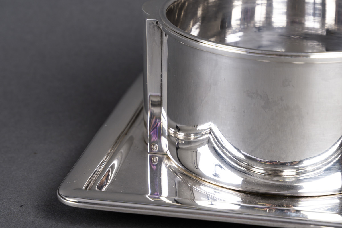 Cette saucière se distingue par une construction à la fois rigoureuse et subtilement architecturée, où chaque élément semble pensé comme une articulation mécanique autant qu’esthétique. Le corps principal, de forme cylindrique parfaitement épurée, présente une paroi lisse et tendue, dont la pureté formelle évoque les recherches modernistes héritées de Kazimir Malevitch.