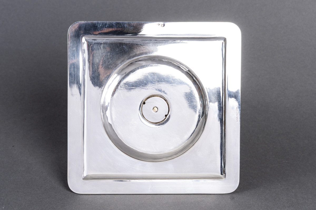 La base carrée, aux angles adoucis et au marli légèrement relevé, agit comme un socle structurant. Elle accueille le corps cylindrique dans une cavité circulaire parfaitement ajustée, créant un jeu de géométries — cercle inscrit dans le carré — d’une grande élégance visuelle. Le dessous laisse apparaître le système de fixation central, avec un disque vissé qui témoigne du soin apporté à la construction et à la précision d’assemblage.